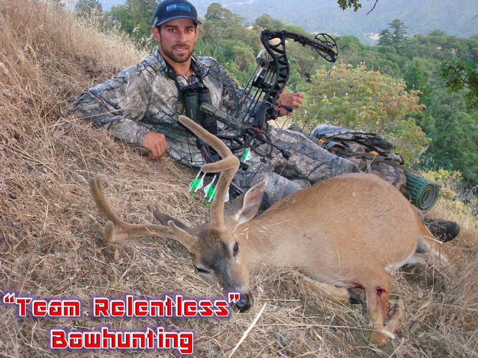 As I moved along a trail and rounded the corner, I spotted 2 sets of horns above the grass right on the edge of a buckeye/oak filled draw. They were just 18 yards away! One was a 4x3, the other a tall narrow 3x3. I said aww, screw it I'll shoot the 4x3 if given the chance. Just when I nocked my arrow something spooked them, and I don't even think it was me, but they ran into the trees and circled downhill. As luck would have it the 4x3 decided to stop in the only opening in there to have a look around. No time to range at this point. I drew back, took one step to my left, guess 55 yards, and smoked him. He bolted down the steep hill for about 40 yards before running out of gas and laying in a bed where I watched him to the head bob for about 5 minutes before calling it quits. By now it was close to 8pm so I had about an hour of light to take pics, quarter him out, and load up my pack. I got the whole buck and all my gear out in one load, but it was about midnight by the time I got back to my truck.